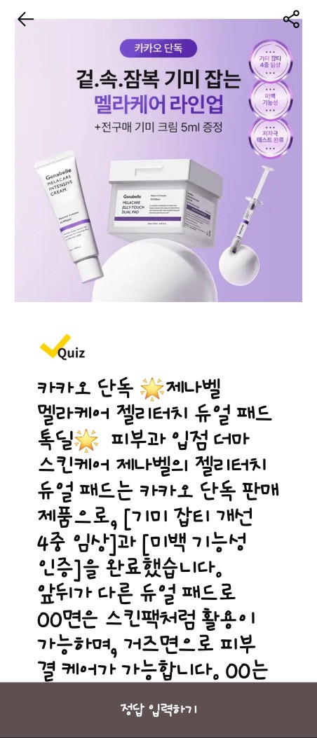 - 문제: 앞뒤가 다른 듀얼 패드로 OO면은 스킨팩처럼 활용이 가능하며, 거즈면으로 피부 결 케어가 가능합니다. OO는 무엇일까요? (초성힌트:ㅈㄹ)
