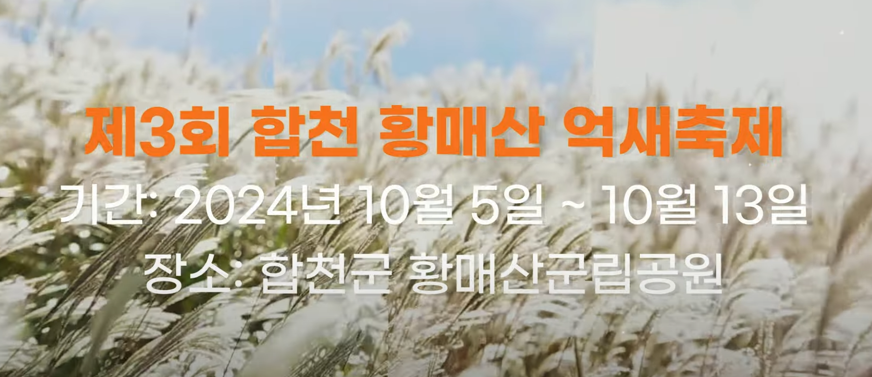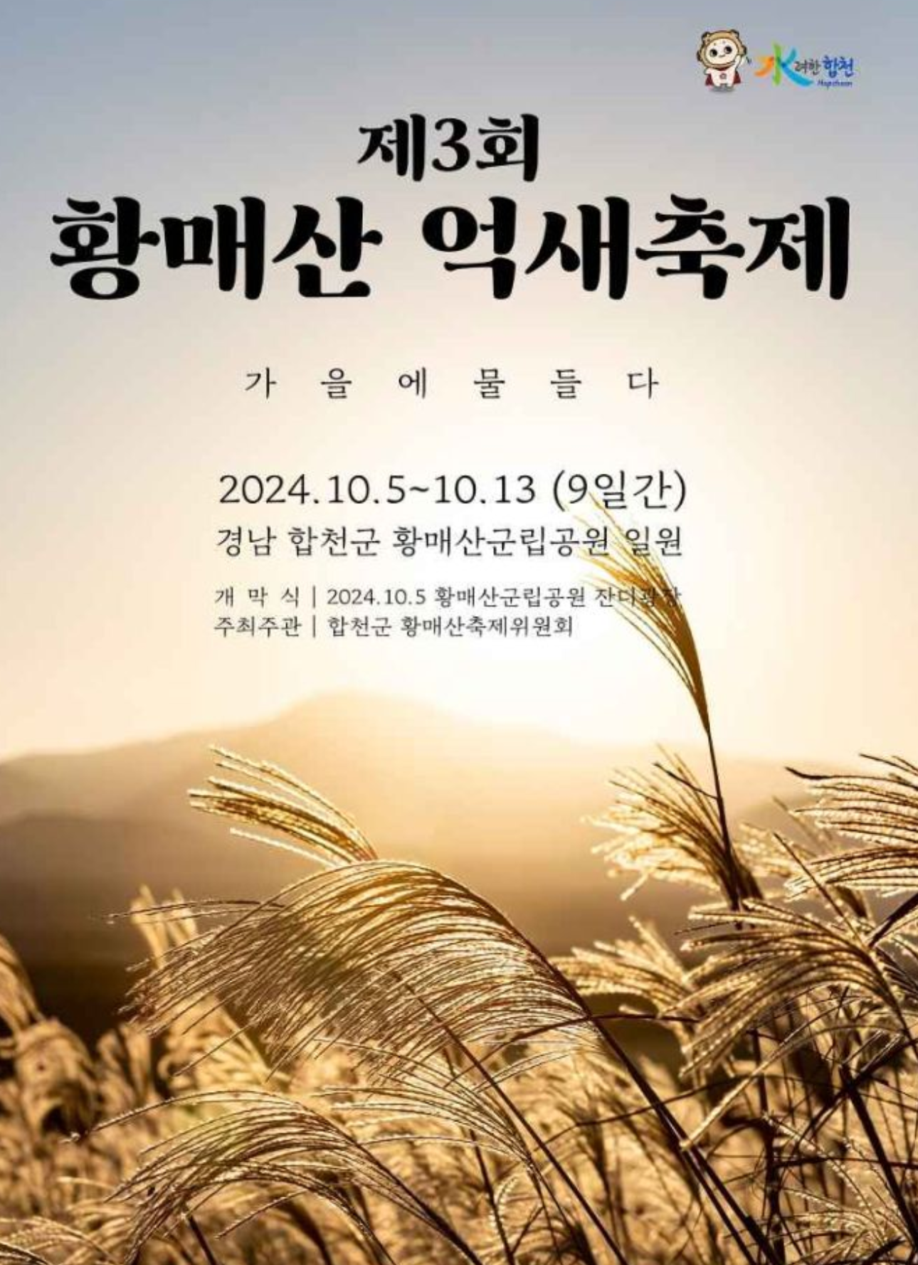 황매산 억새 축제는 2024년 10월 5일 토요일부터 2024년 10월 13일 일요일까지 경상남도 합천군 황매산군립공원에 자생하는 대규모 억새군락지에서 개최되는 가을 축제 입니다. 오전 9시부터 오후 6시까지 관람 가능하며 입장료는 무료입니다.