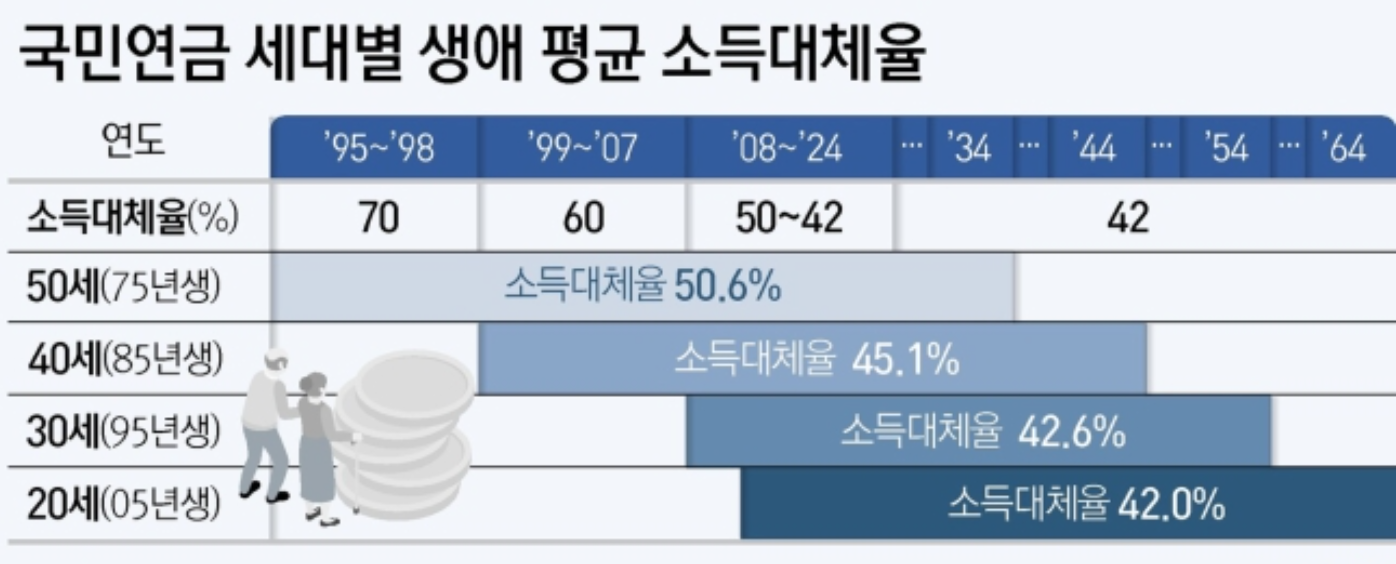 현재 국민연금으로 받는 금액은 소득대체율 42% 수준인데, 이는 내가 벌었던 돈의 42%를 연금으로 받는다는 뜻입니다. 원래는 2028년부터 40%로 줄어들 예정이었지만, 이번 개혁안에서는 42%를 유지하기로 했습니다. 이로 인해 연금을 받는 사람들의 노후 소득이 조금 더 보장될 수 있습니다.