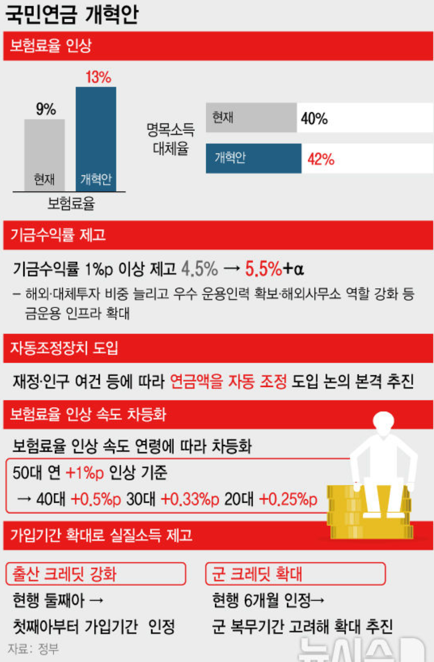 정부가 새로운 국민연금 개혁안을 발표했습니다. 이번 개혁안은 보험료율은 9%에서 13%로 올리면서 국민연금의 재정을 더 오래 유지하고, 특히 젊은 사람들의 부담을 줄이기 위한 내용이 담겨 있습니다. 이번 발표는 21년 만에 이루어진 큰 변화입니다. 주요 내용은 보험료율 인상, 소득대체율 조정, 그리고 자동조정장치 도입입니다. 이제 하나씩 쉽게 설명해 드리겠습니다.