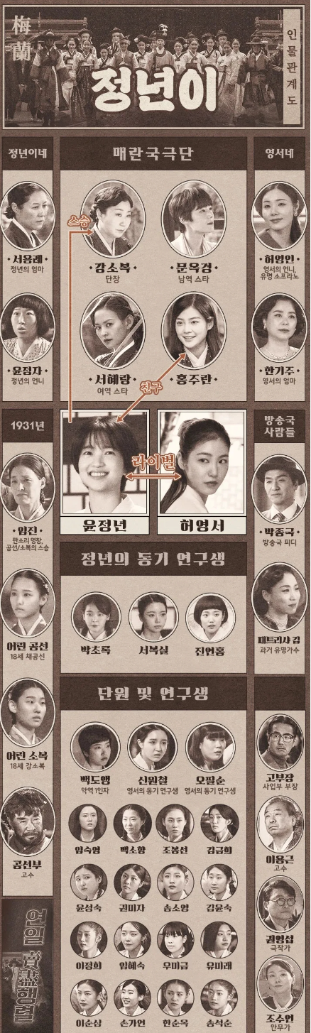 - 허영서(신예은): 매란국극단 연구생으로 탄탄한 실력을 갖추었으나, 정년에 대한 콤플렉스와 질투로 갈등을 겪습니다.