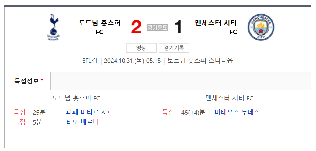 맨시티도 전반 추가시간에 마테우스 누네스가 사비뉴의 크로스를 받아 만회골을 터뜨리며 추격을 시작했습니다. 후반전 내내 맨시티는 토트넘의 골문을 압박하며 역전을 노렸지만, 토트넘 수비진의 견고한 방어와 집중력으로 추가 득점은 허용되지 않았습니다. 결국 경기는 2-1로 마무리되며, 토트넘이 승리의 기쁨을 만끽했습니다.