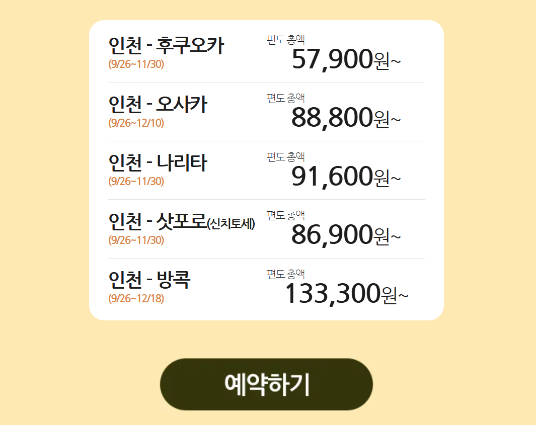 - 가을 단풍과 겨울 온천 여행을 즐길 수 있는 일본 노선부터, 동남아 휴양지까지 다양한 목적지를 저렴하게 이용할 수 있습니다.
