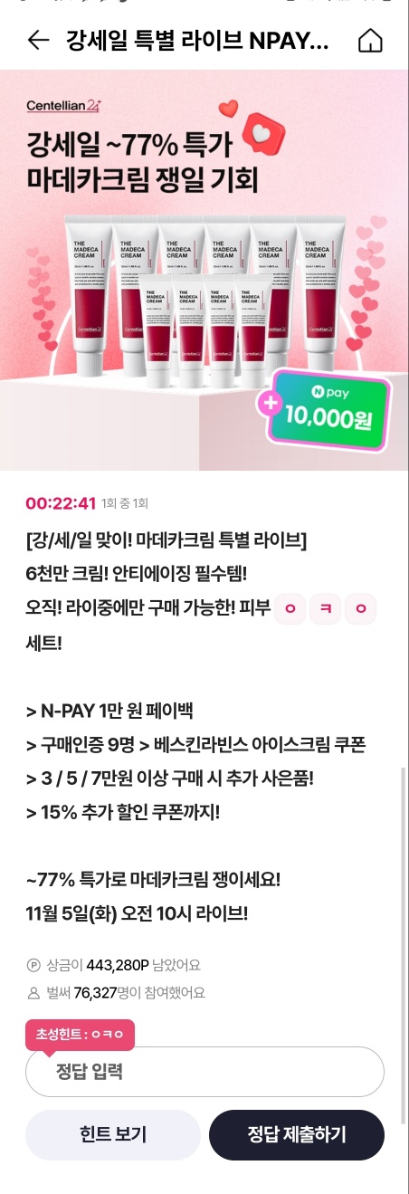 - 퀴즈 질문: 강세일 맞이! 마데카크림 특별 라이브에서 소개되는 ○○○ 세트는?