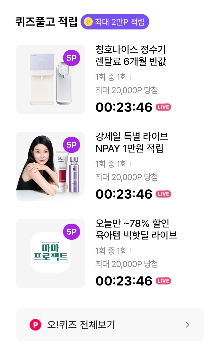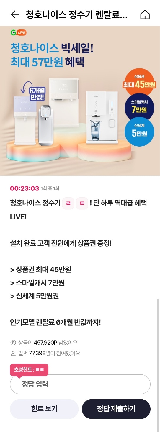 - 퀴즈 질문: 청호나이스 정수기 ○○! 단 하루의 역대급 혜택을 만나는 라이브!