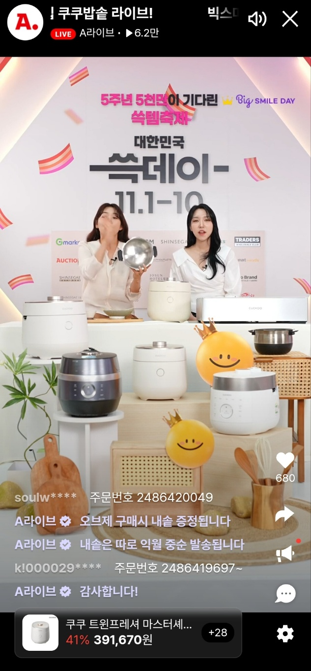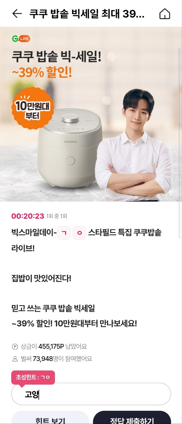 - 문제: 빅스마일데이-○○스타필드 특집 쿠쿠밥솥 라이브! 집밥이 맛있어진다! 믿고 쓰는 쿠쿠 밥솥 빅세일 ~39% 할인! 10만원대부터 만나보세요!