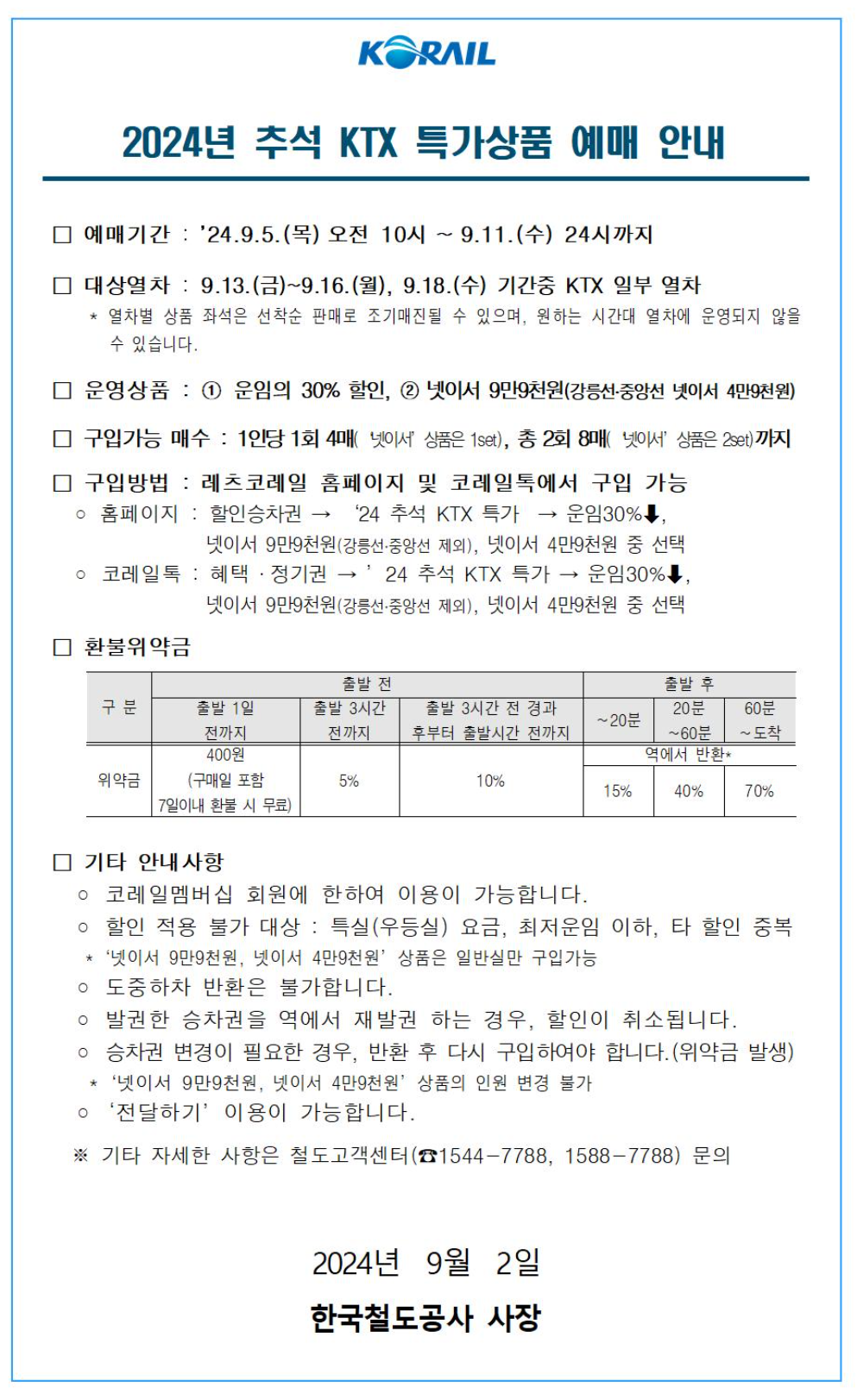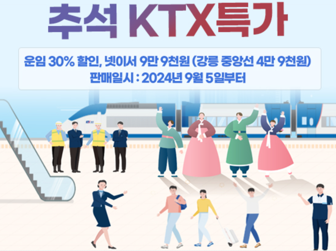 - 코레일톡 앱에서 "2024년 추석 KTX특가"를 선택하여 예매