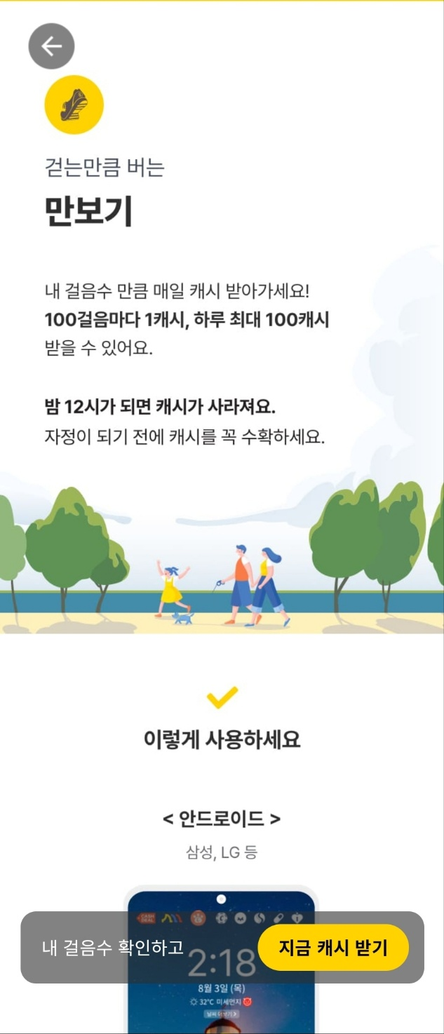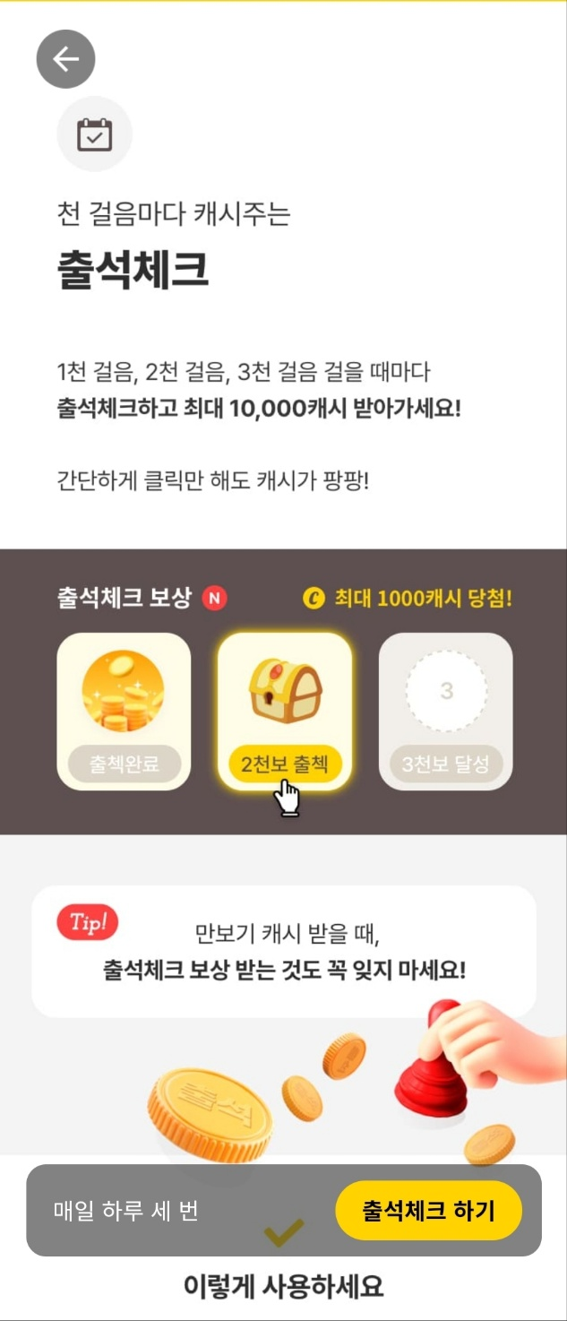 - 만보기 걸음 수 적립: 하루 최대 1만 걸음까지 적립.