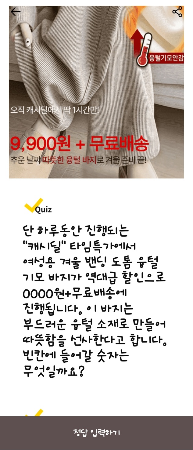 여성용 겨울 기모 바지 캐시워크 돈버는퀴즈