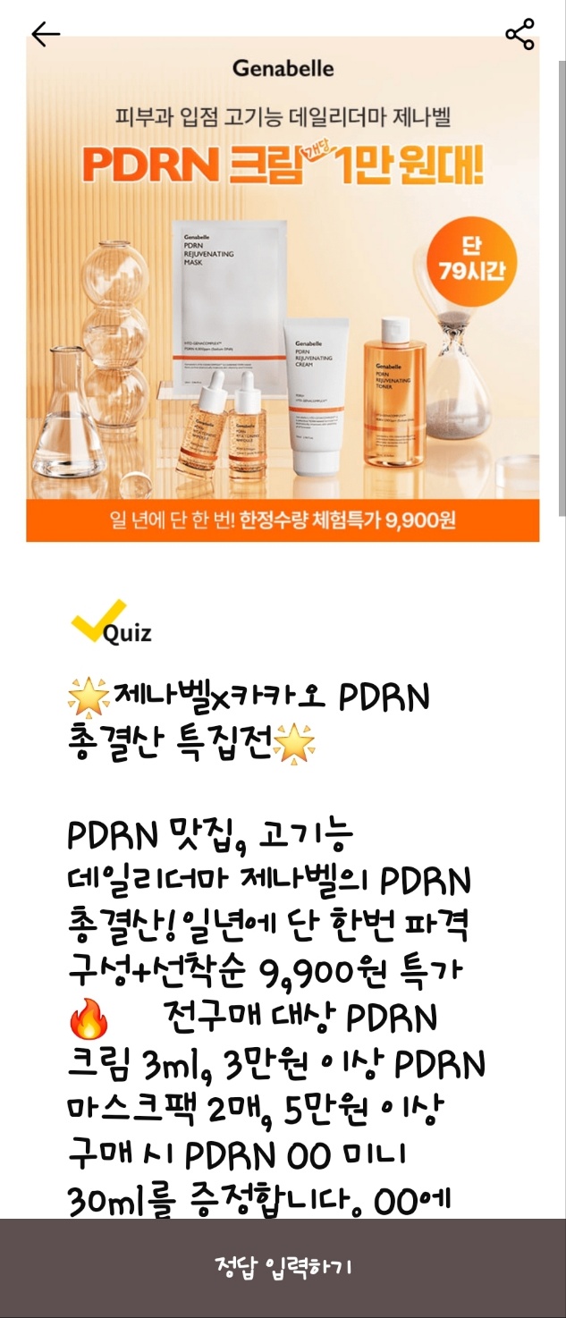 제나벨x카카오 PDRN 총결산 특집전 PDRN 맛집, 고기능 데일리더마 제나벨의 PDRN 총결산! 일 년에 단 한 번 파격 구성+선착순 9,900원 특가 전 구매 대상 PDRN 크림 3ml, 3만원 이상 PDRN 마스크팩 2매, 5만원 이상 구매 시 PDRN OO 미니 30ml를 증정합니다. OO에 들어갈 단어는?