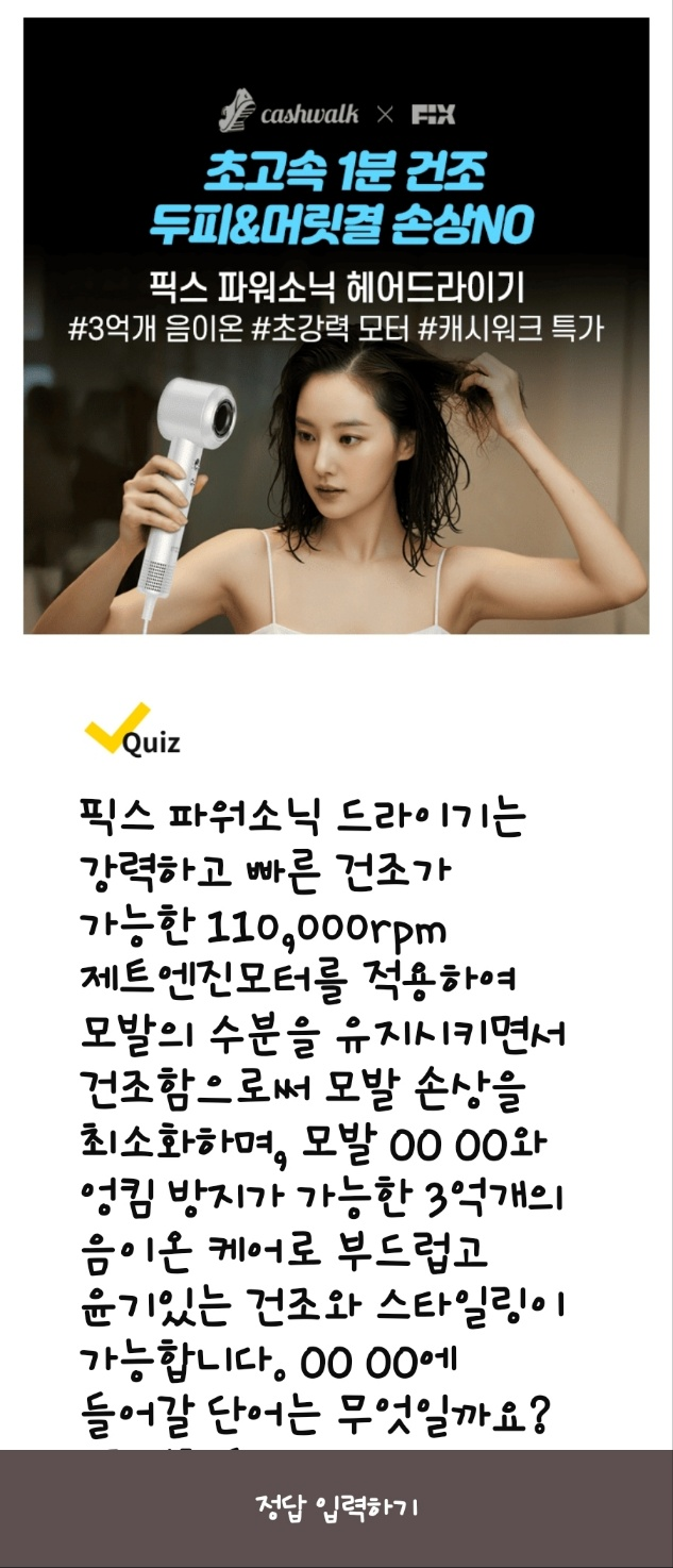 문제: 픽스 파워소닉 드라이기는 110,000rpm의 제트엔진 모터로 빠르게 건조하며 모발 손상을 최소화하고, OO OO와 엉킴 방지를 돕는 3억개의 음이온을 제공합니다. OO OO에 들어갈 단어는 무엇일까요? (초성 힌트: ㅅㅂㅇㅈ)
