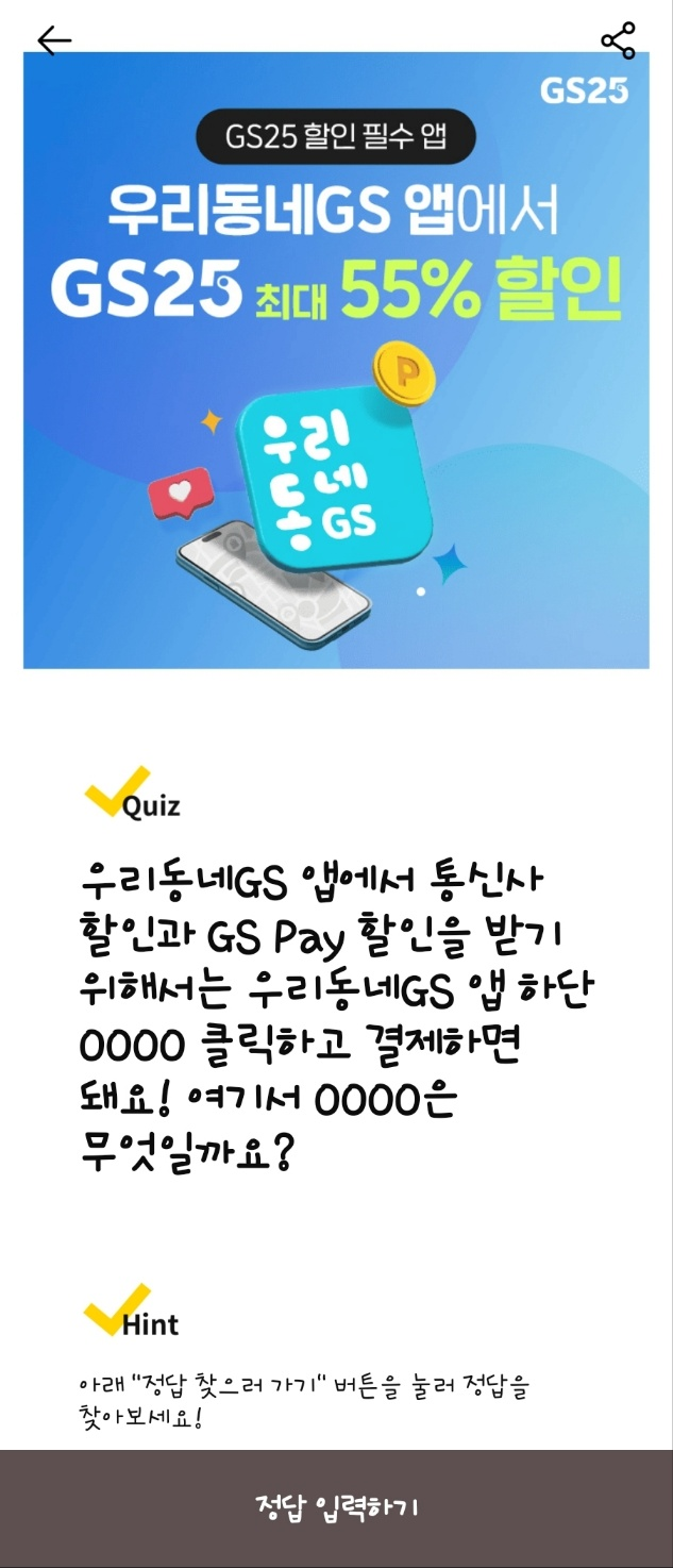 문제: GS 앱에서 결제하면 통신사 할인과 GS OOO 할인을 중복으로 받을 수 있습니다. 여기서 OOO는 무엇일까요?