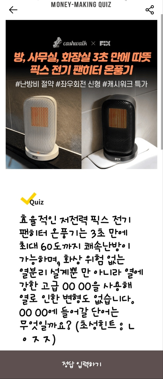 문제: 픽스 전기 팬히터 온풍기는 안전하고 신속한 난방을 제공합니다. 이 제품에 사용된 최고급 난방 시스템 OOO 히터의 이름은 무엇일까요?