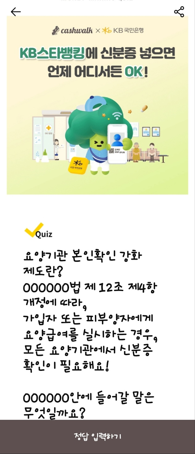 문제: 병원에서 본인확인 필수인 신분증 대신 스타뱅킹에서 OOOOO 서비스에 가입하면 실물 신분증처럼 본인확인이 가능합니다. OOOOO에 들어갈 단어는 무엇일까요? (힌트: ㅁㅂㅇㅎㅇ)