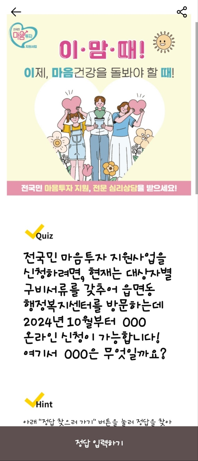 문제: 2024년 7월부터 심리 상담이 필요한 국민을 대상으로 시작되는 전국민 지원 사업. 이 서비스의 이름은 무엇일까요?