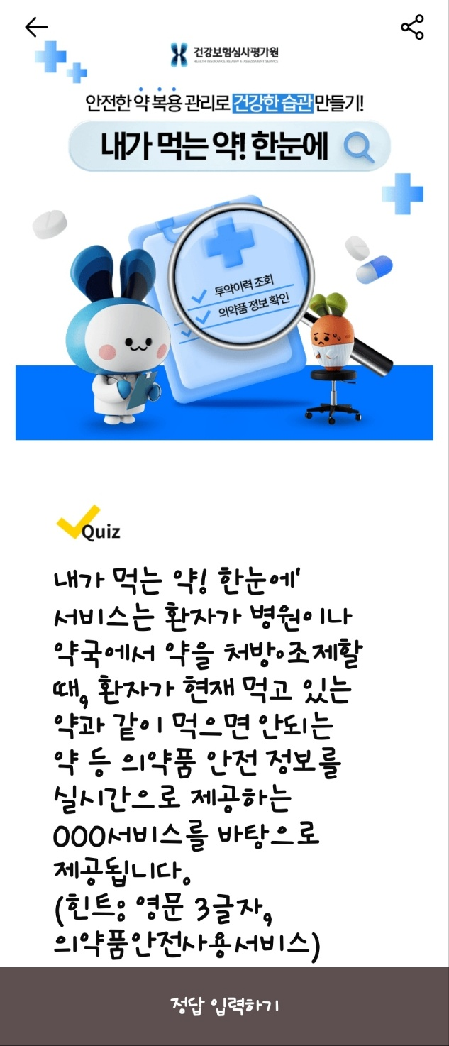 문제: 건강보험심사평가원이 운영하는 '내가 먹는 약! 한눈에' 서비스는 최근 O년간 의약품 투약 내역을 확인할 수 있습니다. 빈칸에 들어갈 숫자는 무엇일까요?