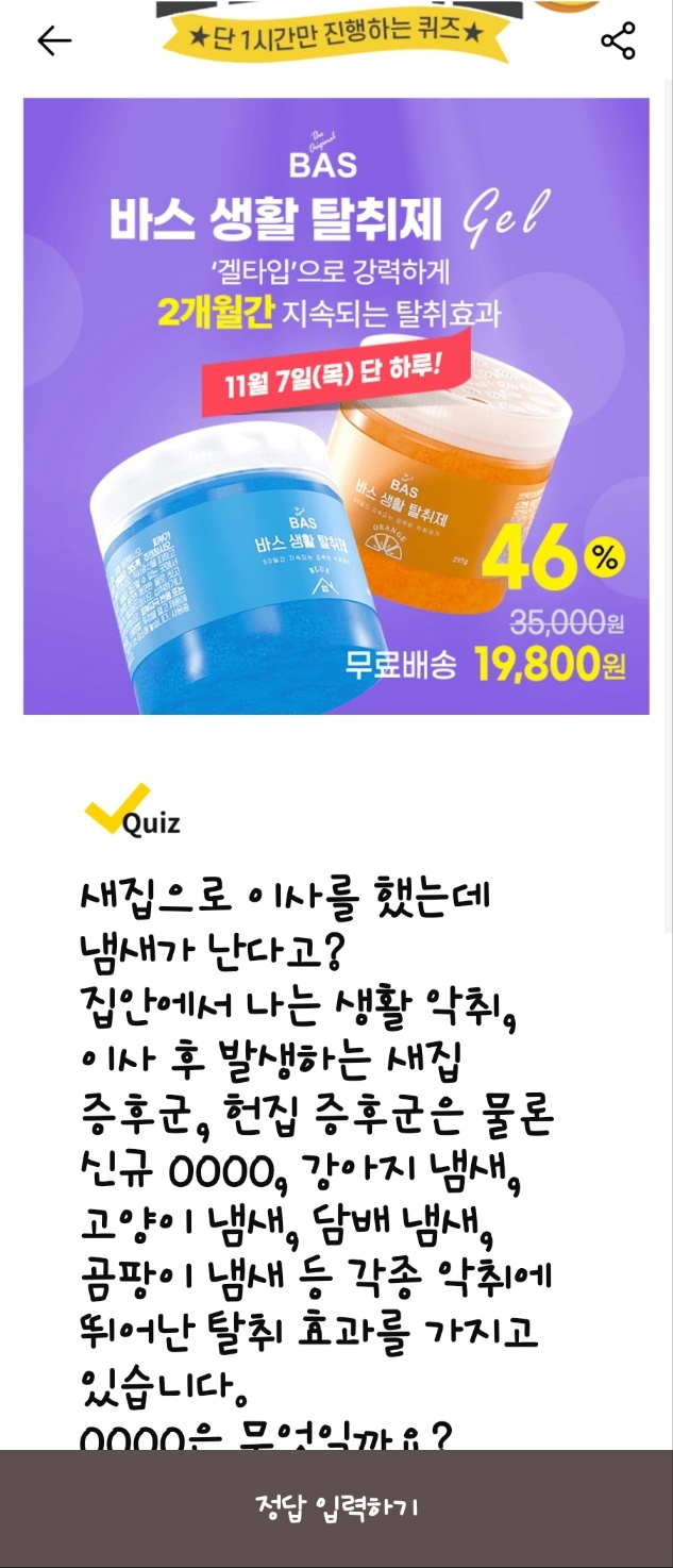 문제: 새집으로 이사 후 발생하는 새집 증후군과 집안에서 나는 각종 악취, 애완동물 냄새까지 강력하게 제거하는 BAS 탈취제. 이 제품은 OOOO 냄새 제거에 탁월한 효과를 가지고 있습니다. OOOO은 무엇일까요?