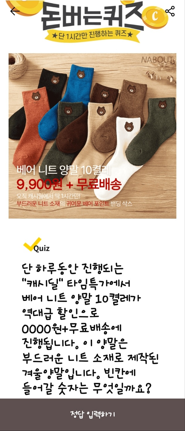 NABOUT 니트양말 캐시워크 돈버는퀴즈 문제
