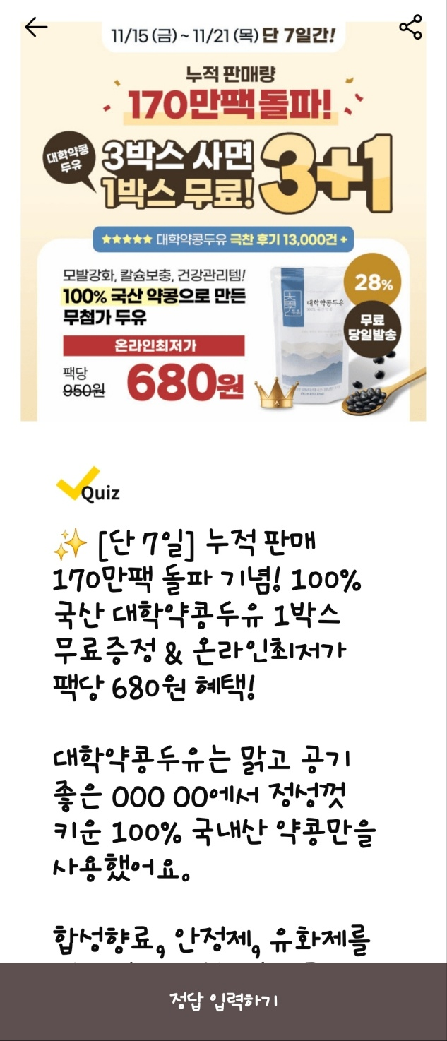 - 문제: [단 7일] 누적 판매 170만 팩 돌파 기념! 100% 국산 대학약콩두유 1박스 무료 증정 & 온라인 최저가 팩당 680원! 대학약콩두유는 첨가물 없이 100% 국산 약콩만을 사용해 약콩의 영양을 통째로 담았어요. 쥐눈이콩이라고도 불리는 약콩은 OOO OO과 고소한 맛이 일품입니다. 진한 맛과 높은 함량의 영양을 느껴보세요! OOOOO은 무엇일까요?