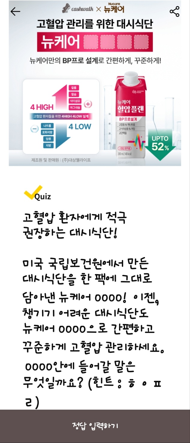 뉴케어 혈압플랜 캐시워크 돈버는 퀴즈