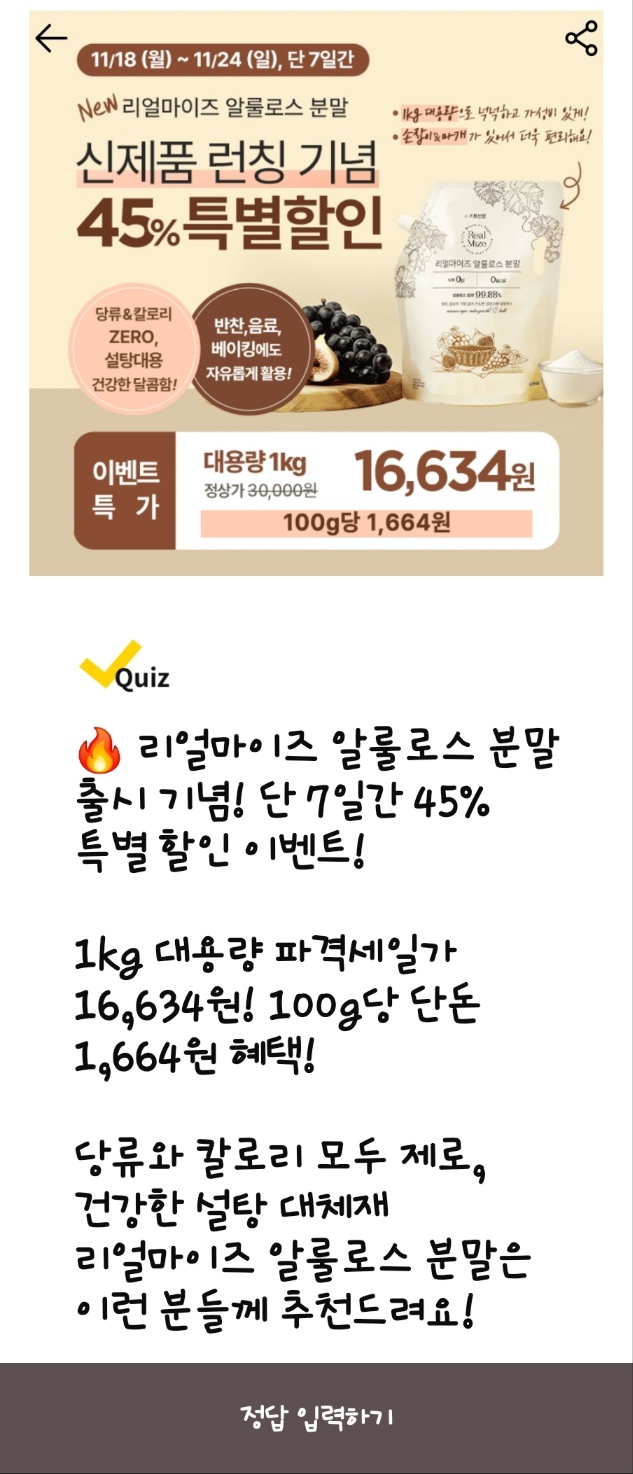 문제: 리얼마이즈 알룰로스 분말 출시 기념! 단 7일간 45% 특별 할인 이벤트! 1kg 대용량 파격 세일가 16,634원! 100g당 단돈 1,664원 혜택! 당류와 칼로리 모두 제로, 건강한 설탕 대체재 리얼마이즈 알룰로스 분말은 이런 분들께 추천드려요! 다이어트 중에도 OOO OO을 원하시는 분들!