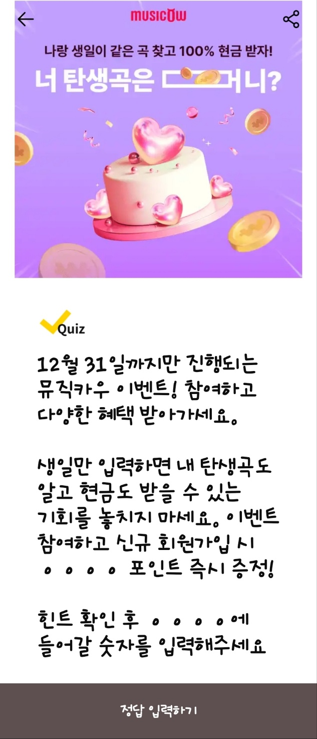 - 보상: 정답을 맞히면 랜덤으로 최대 1만 캐시 적립 가능.