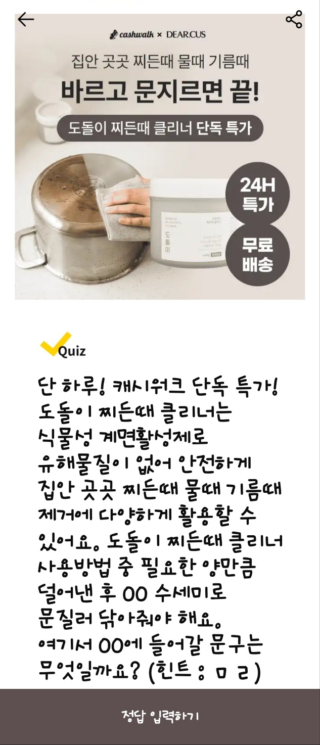 - 문제: "도돌이 찌든때 클리너 사용 방법 중 필요한 양만큼 덜어낸 후 OO 수세미로 문질러 닦아줘야 해요." (힌트: ㅁㄹ)