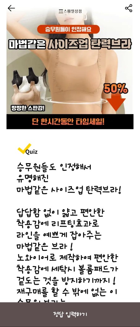 문제: 승무원들도 인정해서 유명해진 마법같은 사이즈업 탄력브라! 노와이어로 제작되어 편안한 착용감과 리프팅 효과까지! 이 브라는 단돈 00000원으로 구매 가능합니다. 빈칸에 들어갈 숫자는?