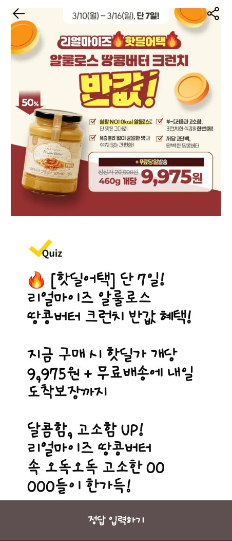 문제: 리얼마이즈 알룰로스 땅콩버터는 아이부터 어른까지 누구나 OOO이 맛있고 건강하게 즐길 수 있어요. OOO에 들어갈 단어는?