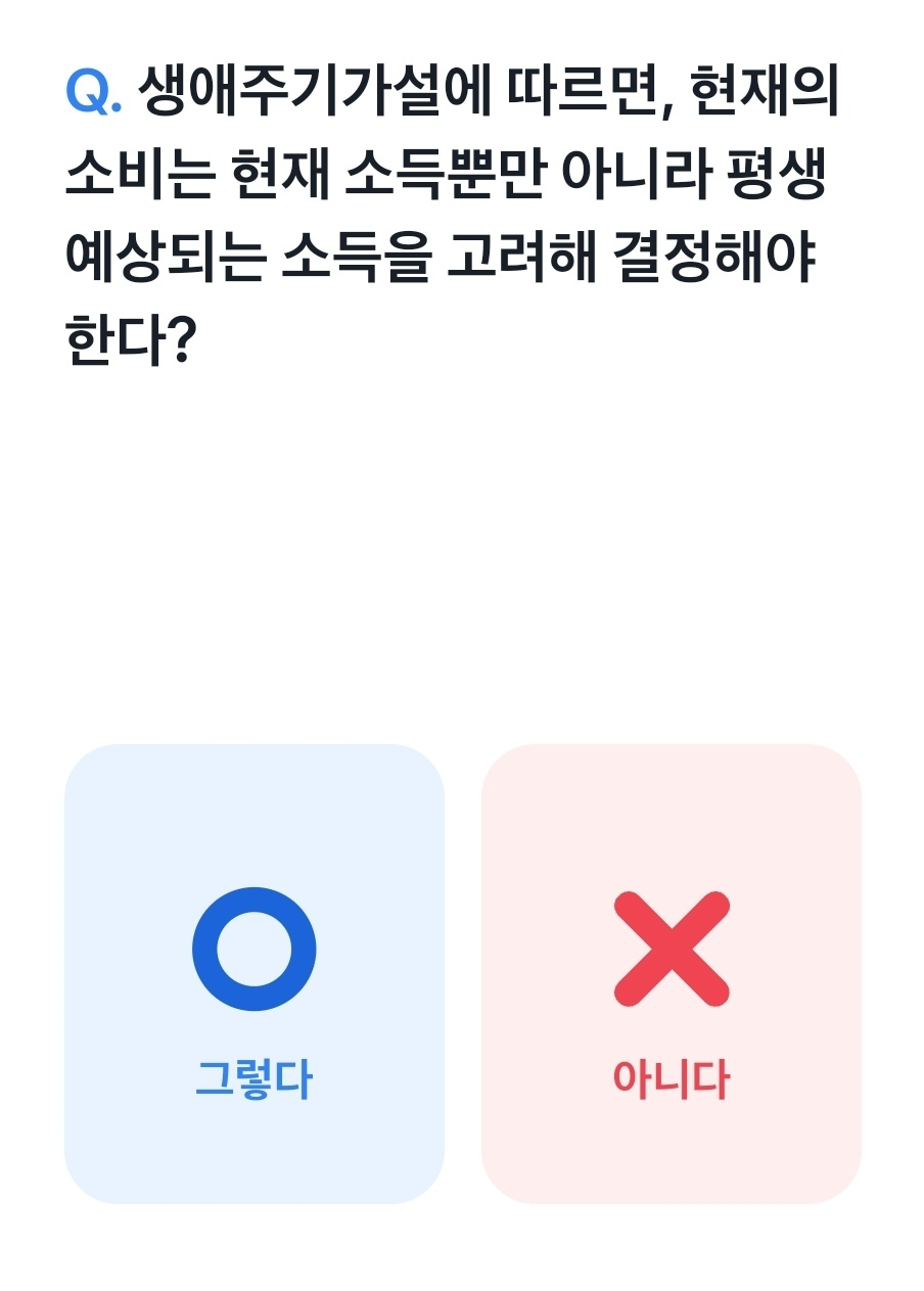 - 문제: 생애주기 가설에 따르면 현재의 소비는 현재 소득뿐만 아니라 평생 예상 소득을 고려해 결정해야 한다?
