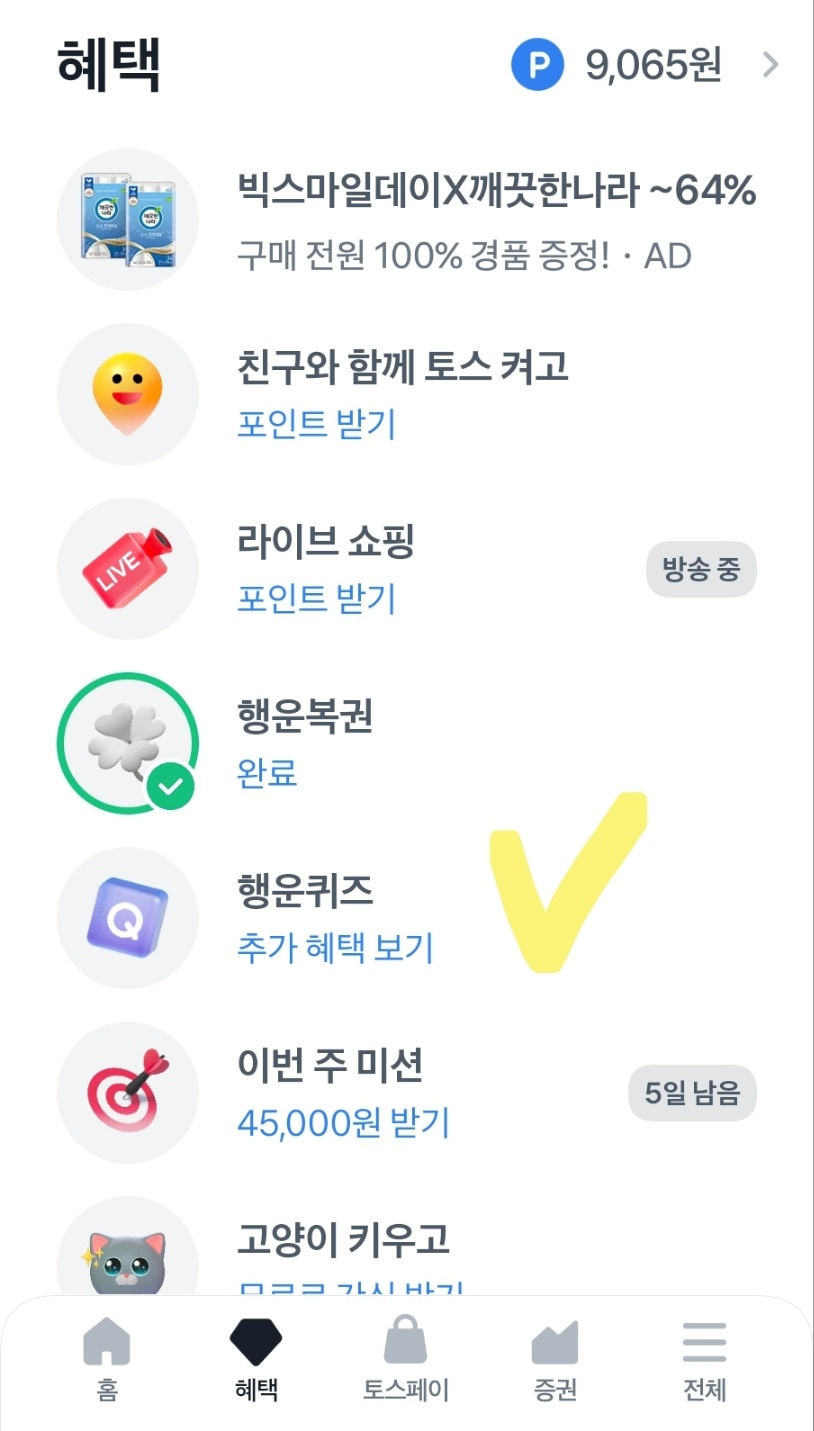 - 토스 앱에서 ‘혜택’ -> ‘행운퀴즈’ 메뉴로 이동하여 퀴즈에 참여할 수 있습니다.