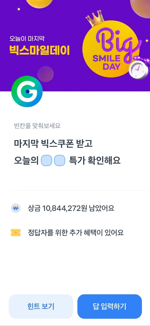 - 퀴즈 문제 확인 후 정답 입력하기 - 무작위로 주어지는 퀴즈 문제를 확인하고, 해당되는 정답을 입력합니다. 예를 들어, "G마켓 빅스마일데이 문제 - 마지막 빅스쿠폰 받고 오늘의 OO 특가 확인해요"와 같은 문제는 정답을 '대표'로 입력하면 됩니다.