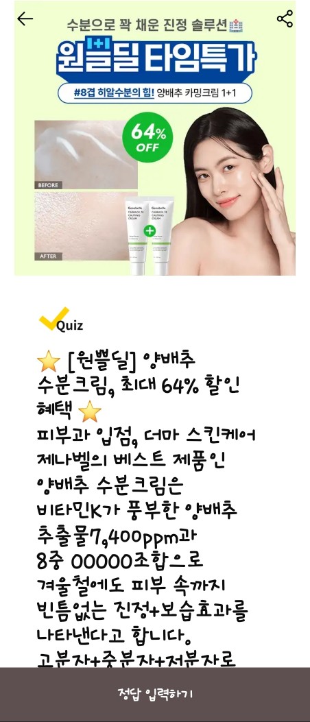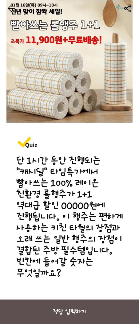 - 문제: “캐시딜 타임특가에서 친환경 롤행주가 1+1 역대급 할인 OOOOO원에 진행됩니다.”
