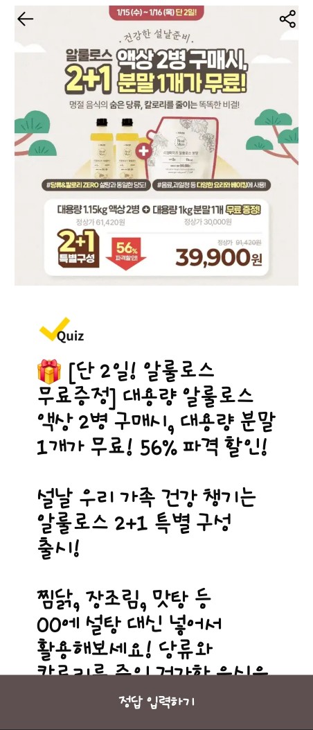 - 문제: “알룰로스 액상 2병 구매 시 대용량 분말 1개 무료! OO OO을 만들 때 설탕 대신 활용해보세요!”