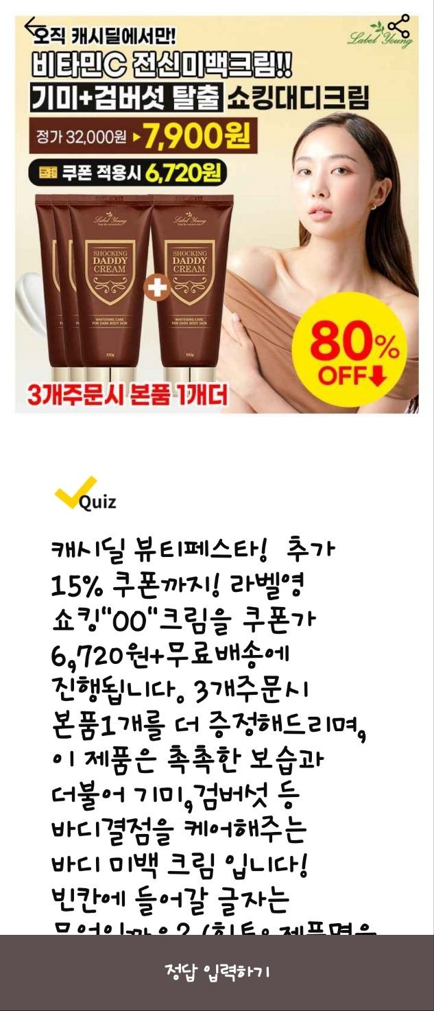 - 문제: 캐시딜 뷰티페스타! 추가 15% 쿠폰까지! 라벨영 쇼킹"OO"크림을 쿠폰가 6,720원+무료배송에 진행됩니다. 3개 주문 시 본품 1개를 더 증정하며, 촉촉한 보습과 함께 기미, 검버섯 등 바디결점을 케어해주는 바디 미백 크림입니다! 빈칸에 들어갈 글자는 무엇일까요? (힌트: 제품명을 확인해주세요!)
