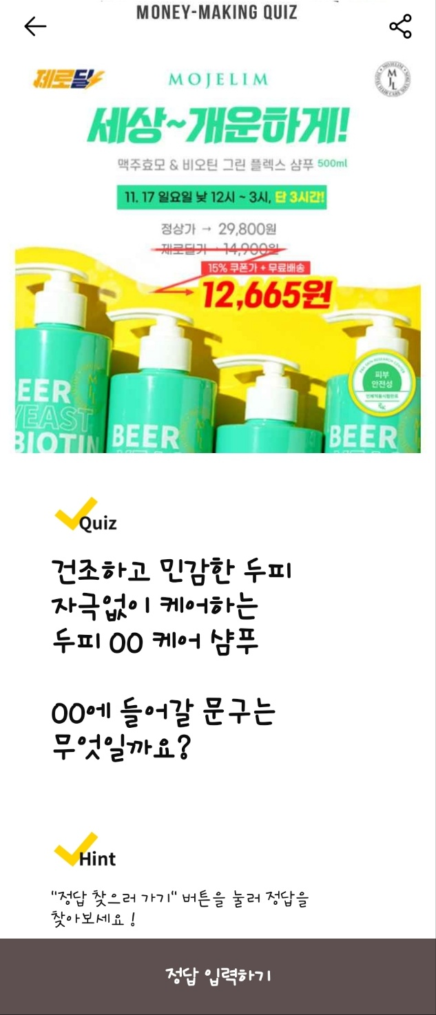 - 문제: 건조하고 민감한 두피를 자극 없이 케어하는 두피 OO 케어 샴푸 OO에 들어갈 문구는 무엇일까요?