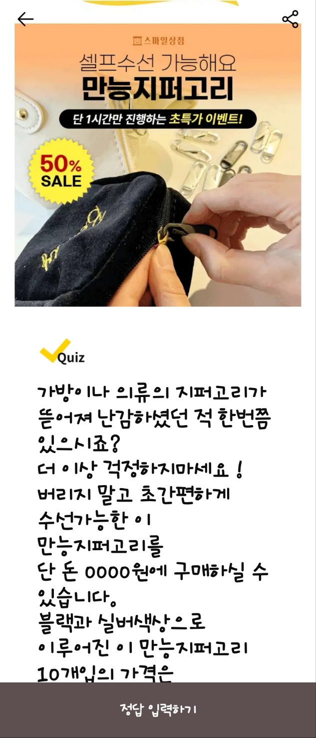 문제: 가방이나 의류의 지퍼고리가 뜯어져 난감하셨던 적 있으셨나요? 더 이상 걱정하지 마세요! 버리지 말고 초간편하게 수선 가능한 이 만능 지퍼고리를 단 돈 0000원에 구매할 수 있습니다. 블랙과 실버 색상으로 구성된 만능 지퍼고리 10개입의 가격은 얼마일까요?