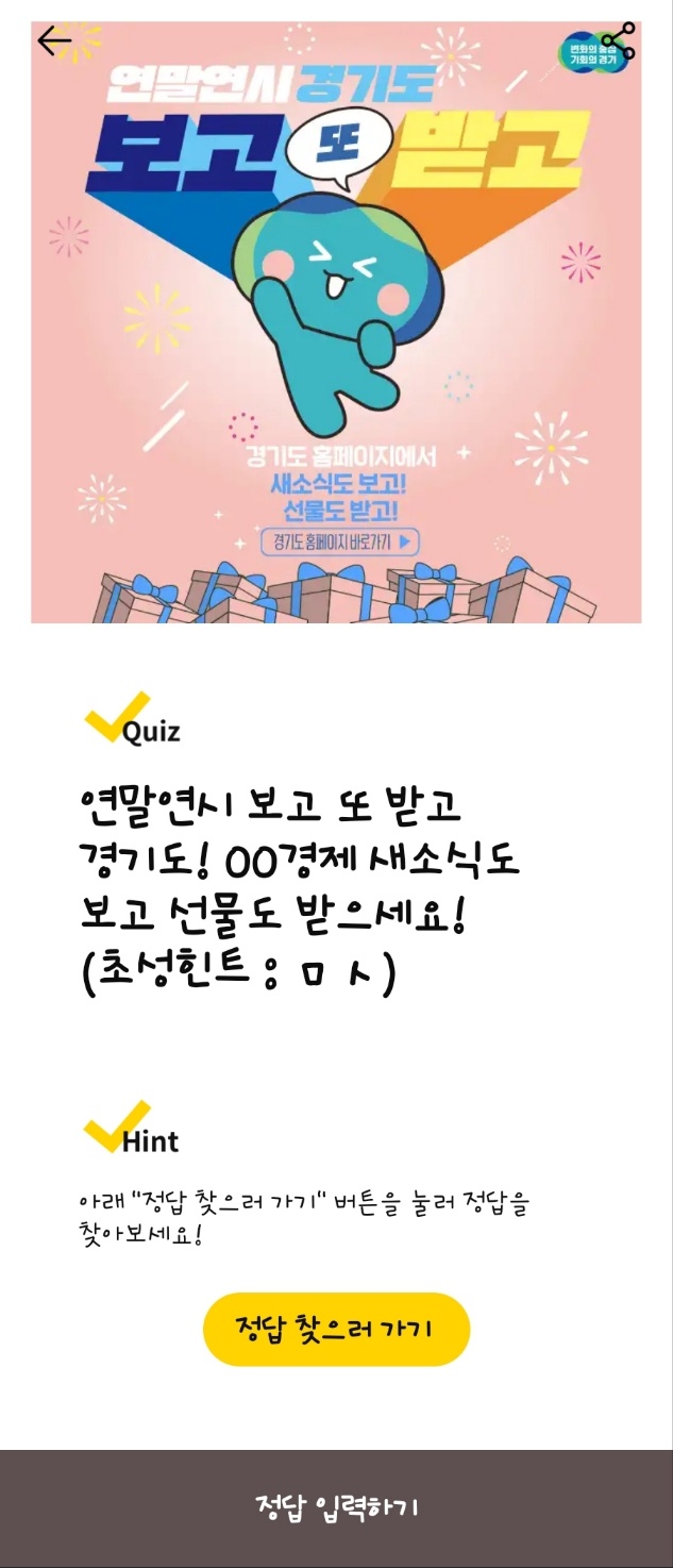 - 문제: "연말연시 보고 또 받고 경기도! OO경제 새소식도 보고 선물도 받으세요! (초성힌트: ㅁㅅ)"