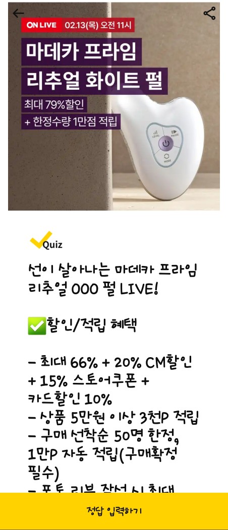 - 문제: 선이 살아나는 마데카 프라임 리추얼 OOO 펄 LIVE! 할인/적립 혜택