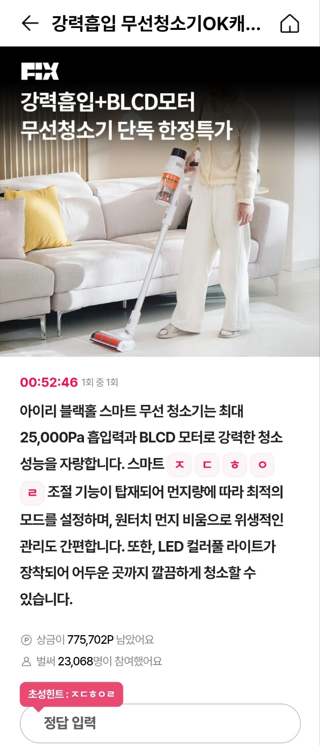 - 문제: 강력한 흡입력을 자랑하는 아이리 블랙홀 스마트 무선 청소기의 기능은 무엇일까요?오늘의 오퀴즈는 오전 10시를 시작으로 오후 6시, 8시, 9시에 추가로 출제될 예정이니 놓치지 마세요!