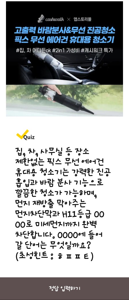 ✅ 정답: 헤파필터 (다른 정답: 핸디형, 코드리스, 고효율모터, 먼지차단막)