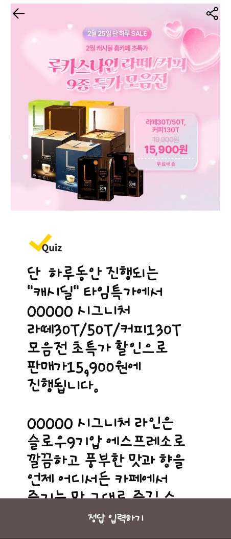 문제: 단 하루 동안 진행되는 "캐시딜" 타임특가에서 OOOOO 시그니처 라떼 30T/50T/커피 130T 모음전이 초특가 할인으로 판매됩니다. 빈칸에 들어갈 단어는? (힌트: ㄹㅋㅅㄴㅇ)