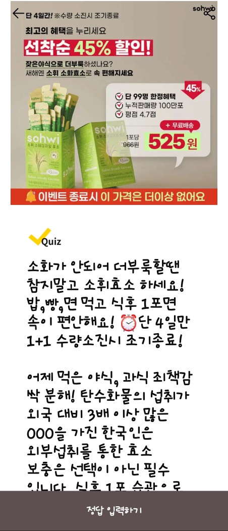 문제: 소화가 안 되어 더부룩할 땐 참지 말고 소휘효소 하세요! 밥, 빵, 면 먹고 식후 1포면 속이 편안해요! 단 4일만 1+1 수량 소진 시 조기 종료! 한국인은 외부 섭취를 통한 효소 보충이 필수! 탄수화물의 섭취가 외국 대비 O배 이상 많다고 하는데요. 여기서 O은?
