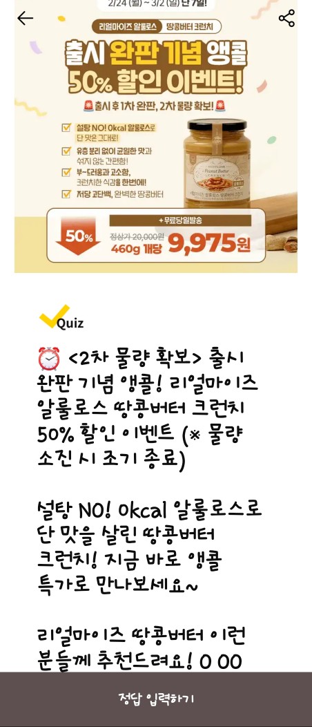 ✅ 리얼마이즈 알룰로스 땅콩버터 캐시워크 돈버는퀴즈 정답