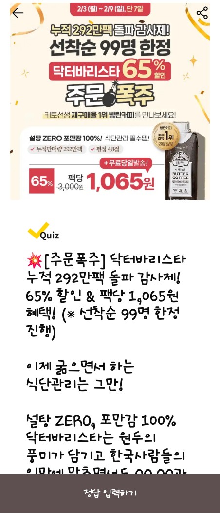 - 문제: OO OO과 방탄커피의 효과는 그대로 담았어요. OOOO은 무엇일까요?