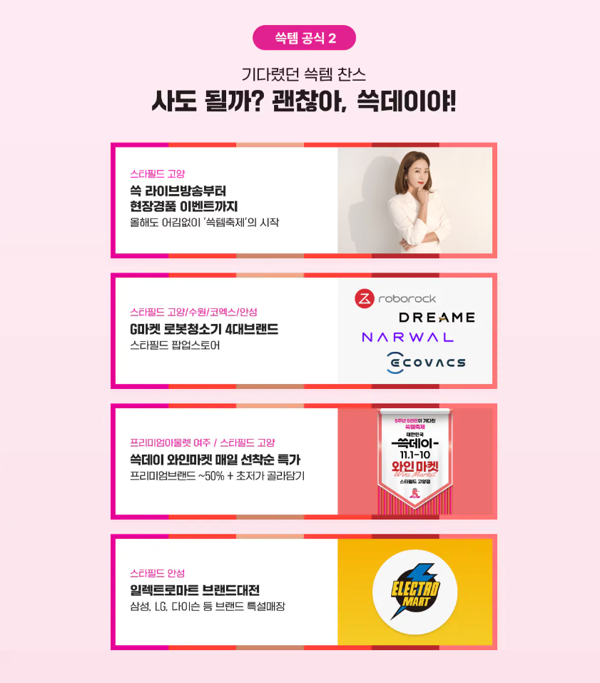 특히 스타필드 고양에서는 쇼핑과 함께 즐길 수 있는 체험형 콘텐츠 ‘쓱데이빌리지’도 준비된다고 합니다. CJ ENM이나 제주항공 같은 제휴사와 함께 다양한 이벤트와 체험을 할 수 있다고 하니, 가족과 함께 가서 즐기면 딱 좋을 것 같습니다.