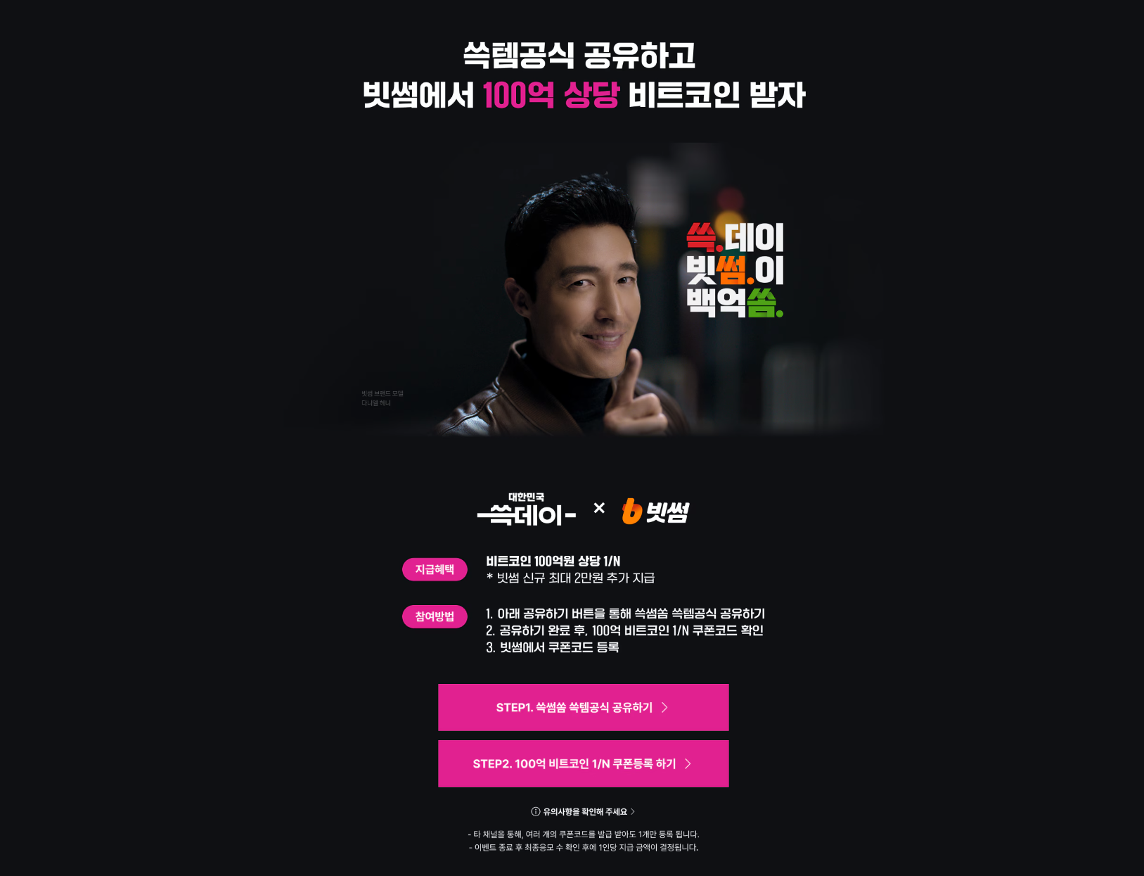 이번 쓱데이에는 특별한 이벤트도 진행된다고 합니다. 가상자산 거래소 ‘빗썸’과 함께하는 ‘비트코인 100억 지급 이벤트’인데요, 쓱데이 기간 동안 행사 정보를 공유하면 비트코인을 나눠주는 이벤트라고 하니, 꼭 참여해보시기 바랍니다.