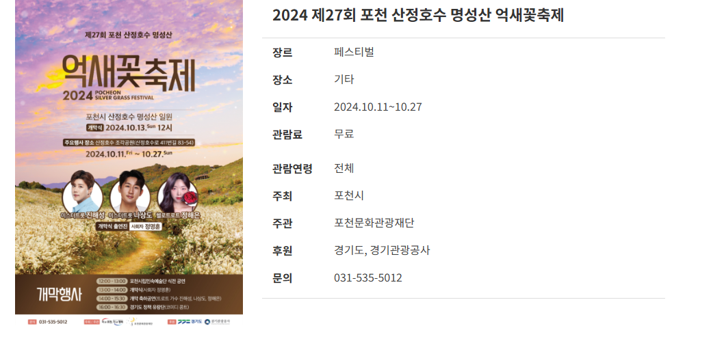 2024 포천 산정호수 명성산 억새꽃축제는 자연과 예술, 감성적인 체험이 어우러진 특별한 축제입니다. 억새밭을 거닐며 가을바람을 맞는 순간, 자연이 주는 편안함과 아름다움을 느낄 수 있습니다. 일상에서 잠시 벗어나 억새밭에서 즐거운 추억을 만들어보세요.