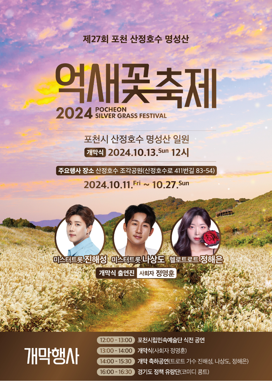 가을이 깊어질수록 산과 들은 아름다운 단풍과 억새의 황금빛으로 물들기 시작합니다. 올해도 포천에서 열리는 가을의 대표 축제, 제27회 포천 산정호수 명성산 억새꽃축제가 여러분을 기다리고 있습니다. 이번 축제는 2024년 10월 11일(금)부터 27일(일)까지 경기도 포천 산정호수와 명성산 일원에서 개최되며, 15만㎡에 이르는 넓은 억새밭에서 가을바람에 일렁이는 황금빛 풍경을 즐길 수 있습니다.
