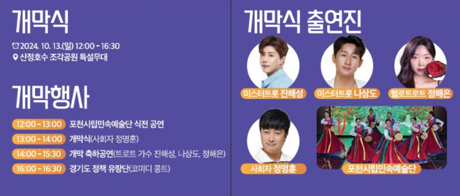 축제 개막식은 10월 13일(일) 12시, 포천시립민속예술단의 멋진 공연과 함께 시작됩니다. 이어서 대형 캘리그라피 퍼포먼스와 인기 트로트 가수 진해성과 나상도의 공연까지, 다양한 볼거리가 가득합니다.